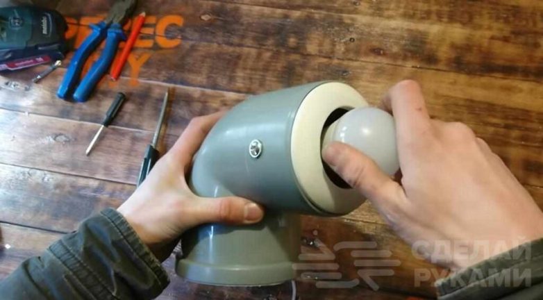 Потом автор вставляет светильник в отвод, и фиксирует его с помощью двух болтов с гайками.