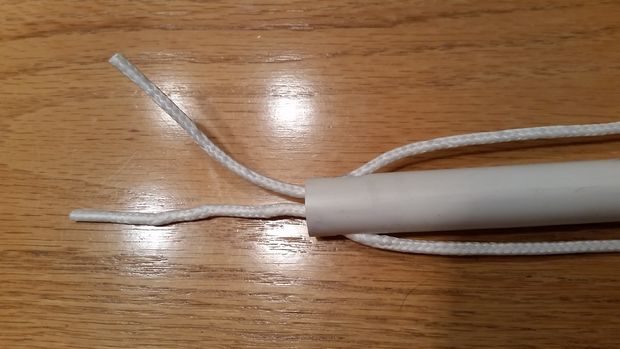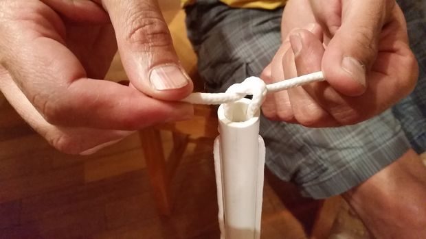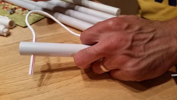 Начиная изнутри планки, пропустите кусок бельевой веревки через прорезь, затем вдоль трубы, сквозь отверстие на другой стороне, опять вдоль трубы, через прорезь на другой стороне и вытащите концы, чтобы они торчали из трубы (чтобы было проще проделать эти операции, можно прикрепить веревку к пластиковой трубочке).