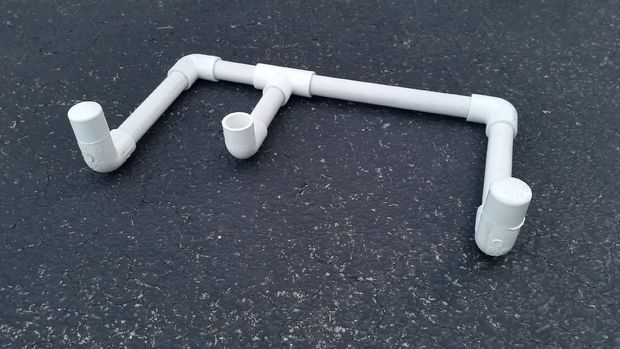 Всего нижняя опора состоит из пяти отводов, двух заглушек, одного тройника и шести коротких кусков ПВХ трубы. Склейте все детали, как показано на фото.