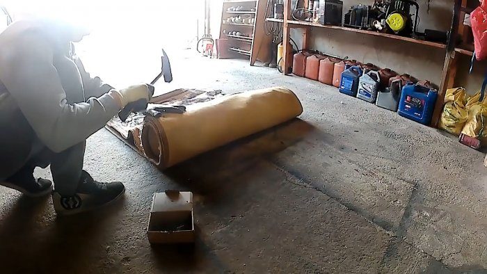 Стараясь не допускать пустот и карманов, как можно плотнее, сворачиваем коврики и закладную деталь в единый цилиндр. После каждого оборота крепим коврики на гвоздь.