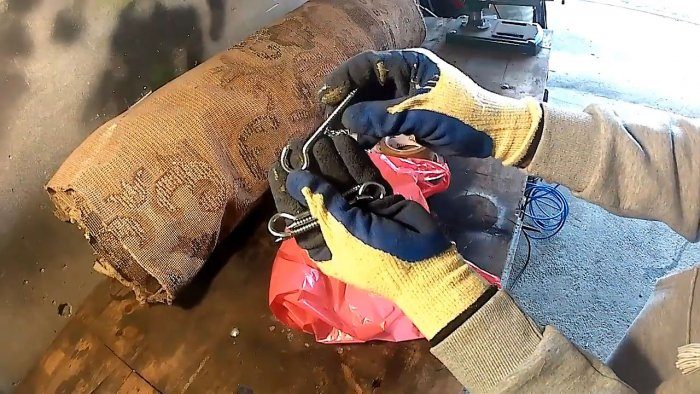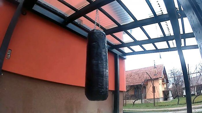 Верхние части цепей соединяем на общий карабин. К нему крепится большой карабин-застежка, с помощью которого наш боксерский мешок подвешивается на любую перекладину или крюк.