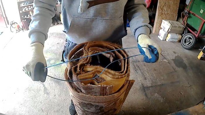 Зашиваем открытый торец мешка тросиком (делаем в ковриках отверстия шилом и протягиваем тросик). Стягиваем торец на узлы.