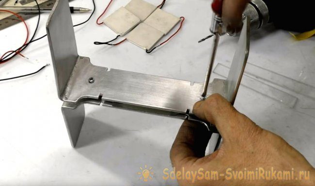 Сгибаем заготовки, чтобы получилось подобие космического корабля из фантастических фильмов про космос. Между ними должно быть пространство. В центре будут проходить провода. Пластиковые накладки полностью скрывают радиатор внутри рукоятки, не дают передавать тепло рук на радиатор. Таким образом мы прикасаемся только к термоэлементам.