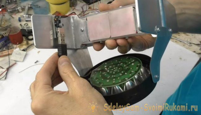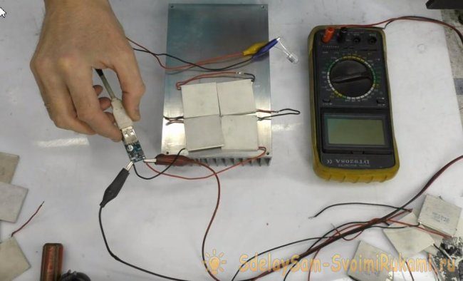 Достаем большой радиатор и проверяем работоспособность схемы. Радиатор охлаждает элементы с низу, а я нагреваю их рукой с верху. На выходе элементов появляется напряжение около полвольта. Этого хватит чтобы запустить повышающий преобразователь. Светодиод, подключенный на выход преобразователя, светиться ярко – свидетельствую о его работе.