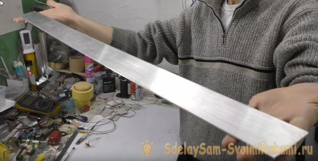 Теперь будем воплощать все в жизнь. Возьмем алюминиевый лист и отрежем полоску. Чем толще алюминий, тем лучше. 1-3 миллиметра будет вполне достаточно.Вырезаем такие заготовки, как лопатки. В центре будут элементы Пельтье, а широкие концы будут служить радиаторами.