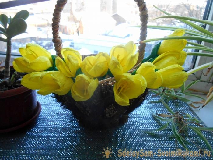 15. Аналогично изготовьте нужное количество крокусов. Эффектно будет смотреться корзинка, наполненная цветами или низкая ваза. Можно экспериментировать с расцветкой, выбирая даже такие цвета, которые не встречаются в природе.