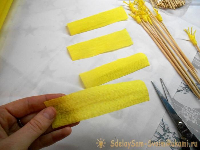 4. Каждую полосу скрутите влажными руками в тонкий жгутик. Это будут тычинки цветка.