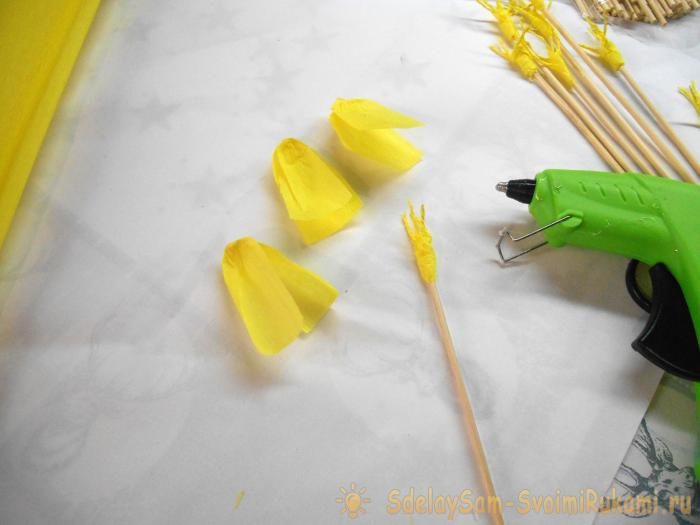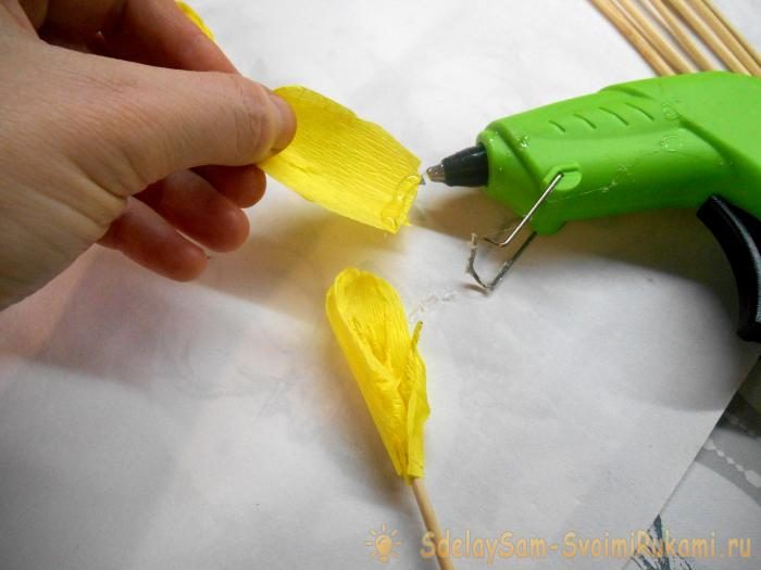 5. Нагрейте клеевой пистолет. Нанесите капельки клея на нижнюю часть заготовки. Оберните ею верхнюю часть деревянной шпажки. Плотно прижмите пальцами, чтобы бумага хорошо приклеилась. Серединка крокуса готова.