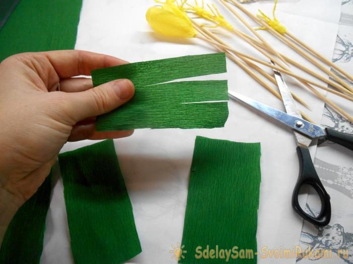 12. Из зеленой гофрированной бумаги изготовим стебелек. Сделайте заготовки размером 6х8 см. Узкую сторону разрежьте на три части, не дорезая до конца бумаги около 2 см.