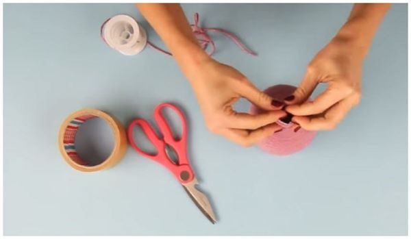 Верхнюю часть пластиковой бутылки нужно полностью обклеить двусторонним скотчем. Можете проделать эту работу в несколько приемов, потому что сразу сделать это затруднительно. Наша задача, чтобы получилось аккуратно, не торопитесь и добьетесь отличного результата.