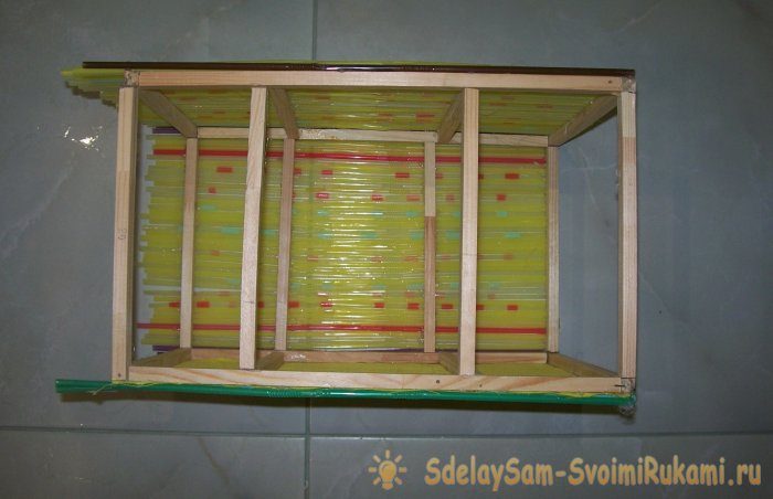 Затем берем клеевой пистолет и начинаем последовательную процедуру: приклеиваем трубочки на деревянный каркас. В итоге у нас должно получиться следующее.