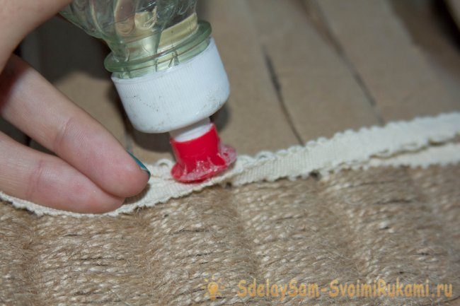 9. Проводим обвязывание нижнего края коробка для того, чтобы закрыть картонные куски, которые выглядывают снизу. Для этого просто вяжем петли в произвольном порядке, цепляемся петлями за нижний ряд джута. Такая хаотичная вязка только придает красоты изделию.