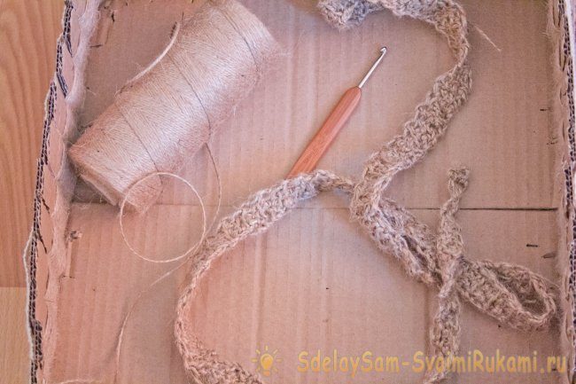10. Для закрытия верхнего ряда вяжем полосу из джута. Она должна состоять из столбиков без накида. В одном ряду должно быть 4 столбика без накида. Можно делать и больше столбиков. Нам по толщине полоски должно будет хватить, чтобы аккуратно закрыть верхний край коробка. Длина полосы должна получиться такой, чтобы ее хватило закрыть бумажные полоски.