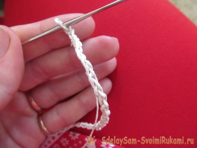 10. Из хлопкового шнура вяжем цепочку. Завязываем ее поверх места крепления тканевой вкладки. Пришиваем цепочку невидимыми швами.