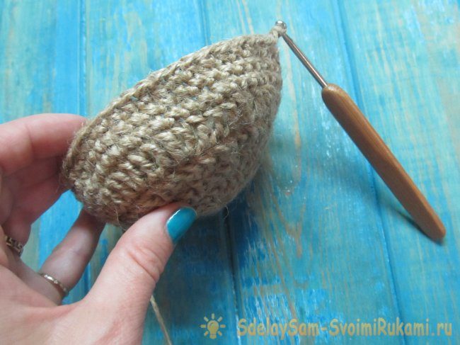 6. В шестом ряду и во всех следующие (примерно будет 22 ряда) вяжем по 52 столбика без накида. Закрепляем нить, когда джутовая корзинка связана, вставляем внутрь джута пластиковый стакан.
