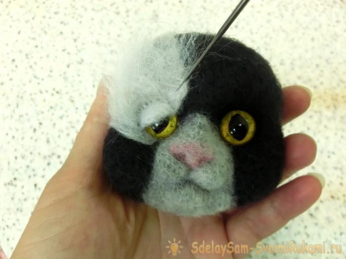 Следующий этап — пушение кота. Здесь нам будет в помощь игла обратного хода. Ею пройдите всю поверхность мордочки кроме ушей, век и серой области в центре. Также обработайте поверхность туловища, лапы, и хвост не трогайте. Затем подстригите длинную шерстку как вам надо.