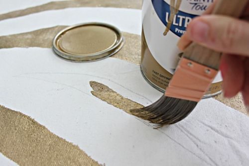 Как только полосочки нарисованы, время перейти к их окраске. У нас выбрана золотая краска, потому что хотелось добавить немного блеска в пространство. Это может быть любой другой цвет. Розовая зебра будет очаровательным дополнением для комнаты маленькой девочки!Если краска имеет жидкую консистенцию, необходимо ее оставить открытой на 30 минут перед покраской. Иначе она будет растекаться оставлять более глянцевую поверхность. Оставленная открытой краска немного загустеет. Можно перелить часть краски в меньшую емкость.