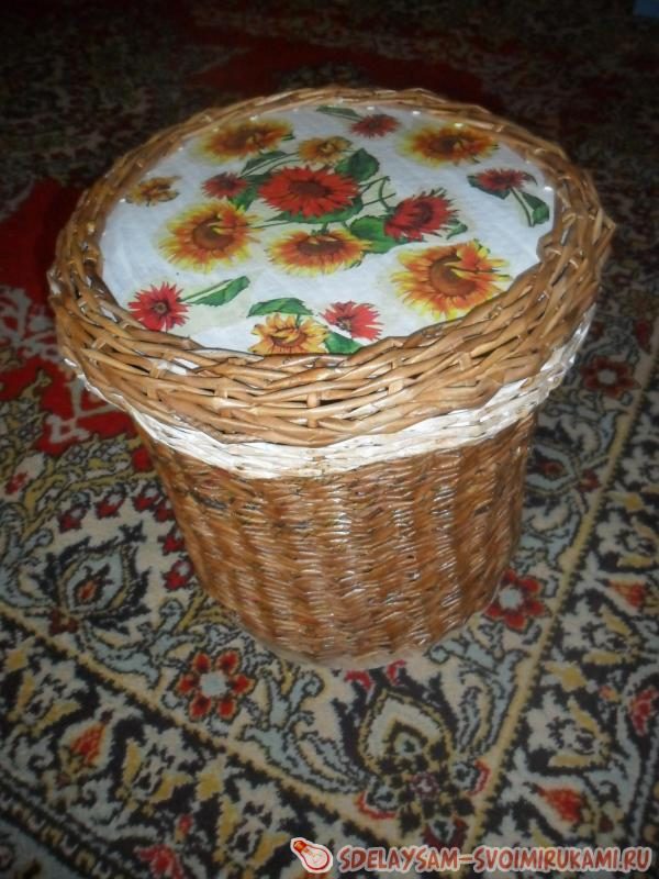 Очень популярное хобби — плетение из газетных трубочек — позволяет изготовить не просто декоративные корзинки, но и вполне практичные вещи. Например, пуфик для ребенка: на нем мой сын с удовольствием сидит во время просмотра мультфильмов.