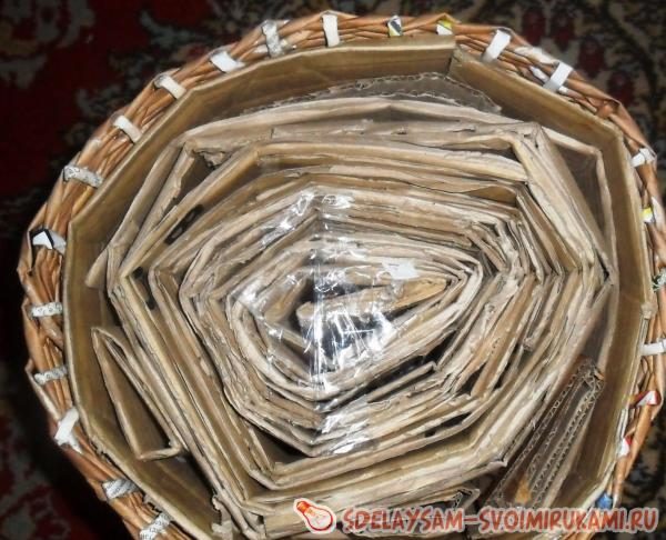 Когда устойчивость станет достаточной, можно вырезать дно. Берем что-то подходящее по размеру (кастрюлю, например), предмет должен быть немного больше основания, используем в качестве формы.