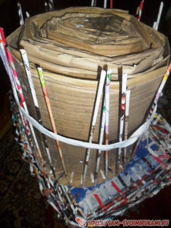 Хвосты можно прикрыть, наклеив сверху ткань, или кусок картона такого же размера. Поскольку стойки длинные, я прихватила их обычной бельевой резинкой, чтобы не разваливались в стороны. После нескольких рядов необходимость в фиксации отпадает, стойки поддерживают трубочки.