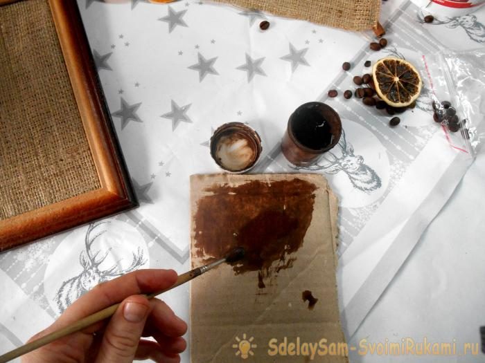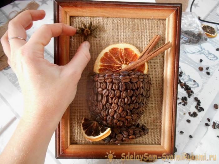 16. Пустое пространство в верхней части панно заполните узорами из кофейных зерен, приклейте звездочки бадьяна.