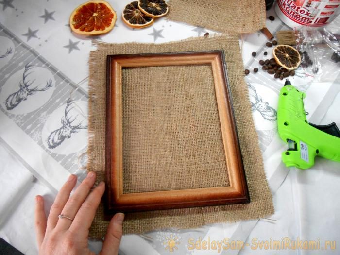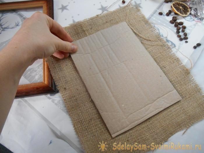 1. Изготовим основу для панно. Для этого вырежьте из плотного картона заготовку под размер рамки. Подберите кусок мешковины чуть большего размера, чем рамка.