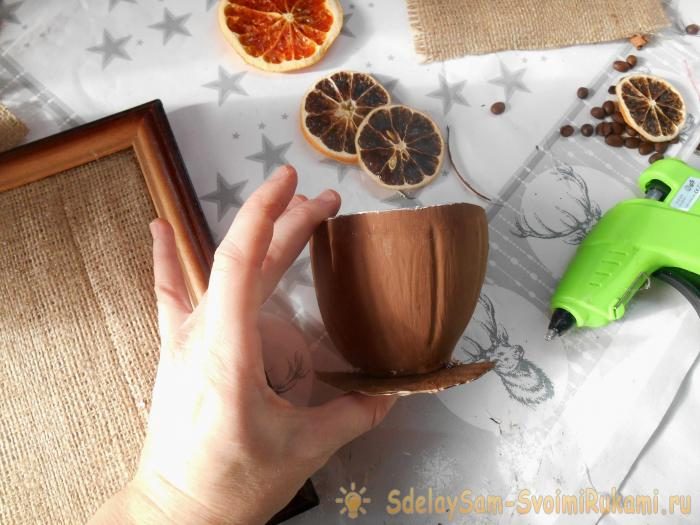 12. В последнюю очередь обклейте зернами блюдце. Нижняя часть блюдца на панно будет почти не видна, поэтому ее можно обклеить обломками кофейных зерен.