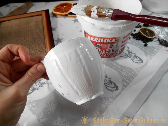 6. Пластиковую заготовку вскройте белой акриловой краской. Оставьте в теплом месте до полого высыхания.