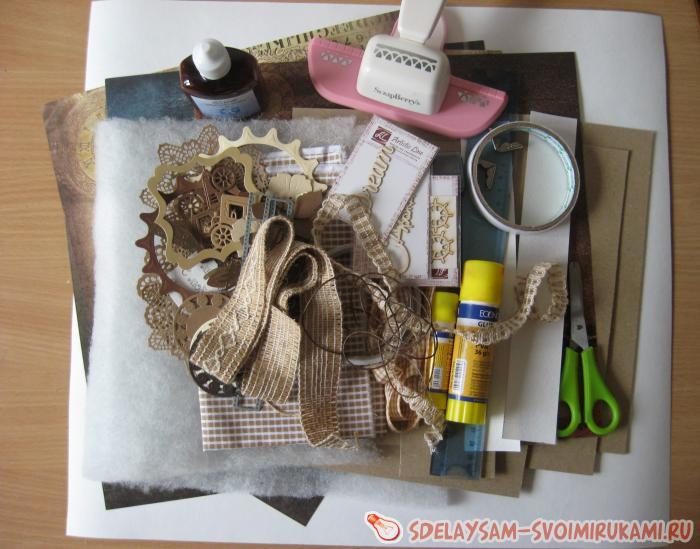 Коробку вклеиваем вовнутрь, закрываем ее и что-то кладем сверху, желательно оставить на ночь, чтобы полностью высох клей. Клеим ленту с мешковиной и чипборды. Одеваем металлические уголки и готово.