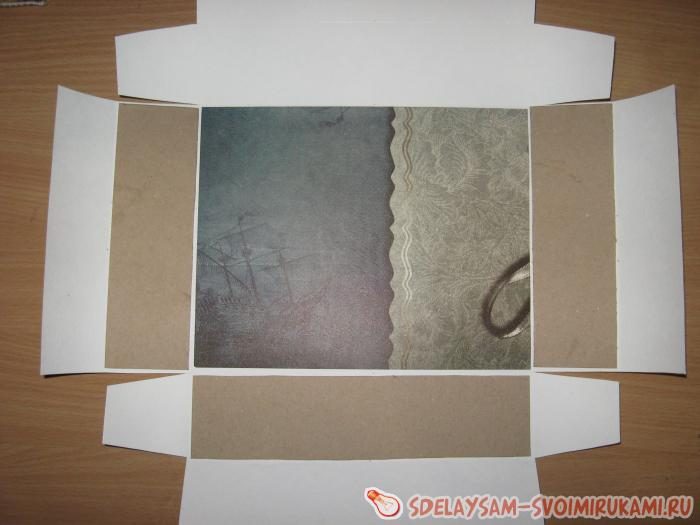 Клеим прямоугольник внутри, на три стороны вовнутрь вклеиваем переплетные стороны, чтобы шкатулка была устойчивая. Собираем и склеиваем полностью основную часть нашей шкатулки.