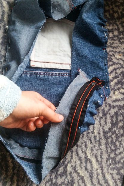 Приколите булавками одну половину джинсовой полоски лицевой стороной вниз к правой части молнии и сшейте их настолько близко к зубчикам молнии, насколько возможно.