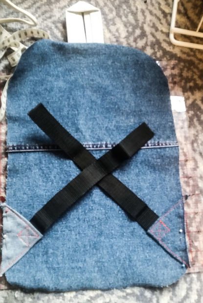 Разместите треугольники на одинаковой высоте от нижней кромки спинки рюкзака и пришейте их.