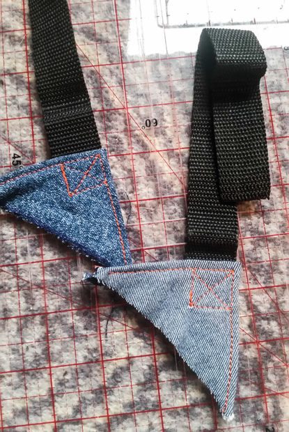 Выверните треугольник и лямку лицевой стороной наружу и прострочите угол. Для большей крепости сделайте квадратный шов сквозь ткань и кончик лямки, который вы оставляли торчащим из треугольника.