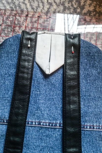 Положите лямки лицевой стороной вверх на заднюю часть рюкзака по обе стороны от верхней ручки и пришейте их.