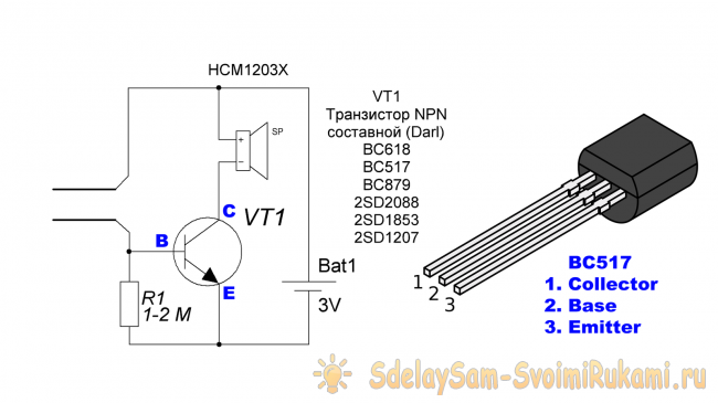 Один транзистор BC517, BC816 или любой другой NPN структуры. Отечественный аналог – кт315, кт3102.