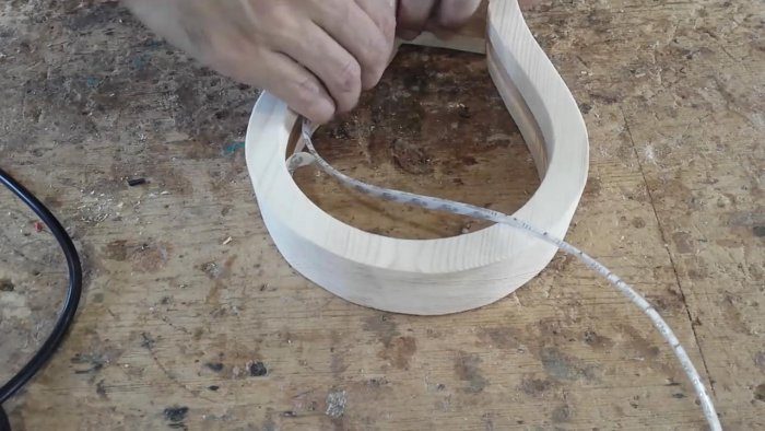 Беру моток светодиодной ленты, и завожу его в паз лампочек, чтобы замерять необходимую длину окружности. Далее отрезаю 3 куска ленты. Включаю паяльник и паяю на лентах провода для подключения к блоку питания. Длина проводков у каждой заготовки разная. Использую отрезки 40, 50 и 60 см.
