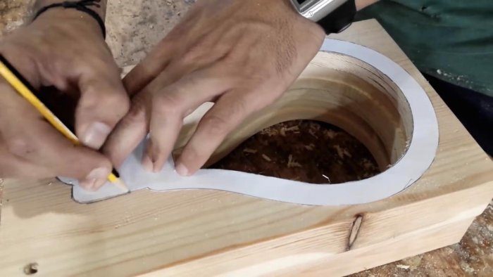 Далее вырезаю бумажный шаблон до конца и прикладываю его к обработанной заготовке. Обвожу внешние габариты лампочки. Здесь главное держать бумагу плотно прижатой, чтобы она не сдвинулась, поскольку в дальнейшем такая ошибка будет заметна на готовой детали.