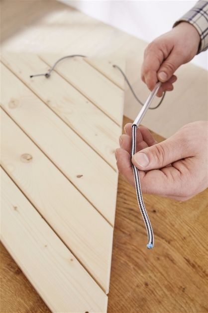 Осталось прикрепить столик к перилам балкона. Для этого просверлите 3 отверстия в углах обеих столешниц. Отверстия должны соответствовать толщине нейлонового шнура (максимальный диаметр 5 мм). Затем отрежьте 3 равные части шнура. Пропустите подготовленный шнур через отверстия, установите распорки между двумя столешницами, завяжите узлы под нижней и над верхней столешницами. Прикрепите три верхних конца шнура к перилам балкона. Ваш столик готов!