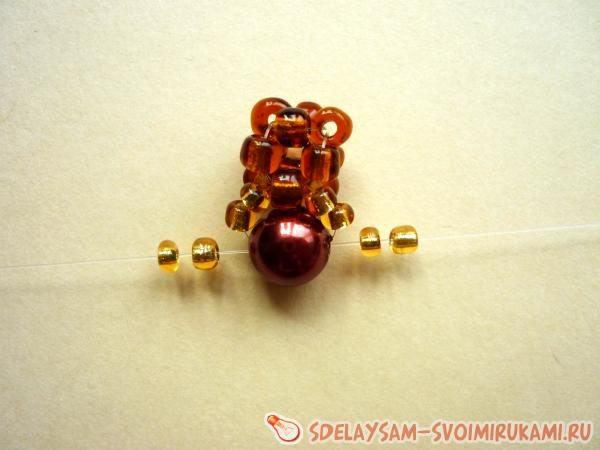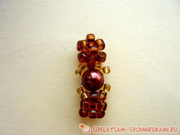 Теперь начинаем снова плести шарик. Закрепляем тёмно-коричневой бисеринкой светлый бисер. Возможно, будет немного распускаться леска. Нужно постоянно затягивать леску и когда очередной шарик будет готов, то плетение будет прочным.