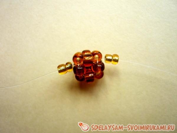 Плетём цепочку из четырёх «крестиков» по уже известной нам схеме. Формируем шарик, затягивая концы лески в первую крайнюю бисеринку. Затягиваем шарик, сплетая его боковые стороны. Концы выводим в одной верхней бисеринке по центру шарика.