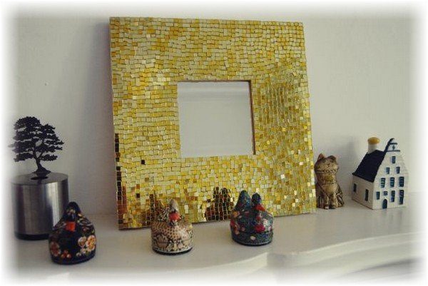 Это зеркальная мозаика, и это очень интересная штука. Чтобы сделать подобное зеркало Вам понадобится белая акриловая краска, зеркало, золотая акриловая краска, кисть, клейкая лента и мозаика нужного цвета.