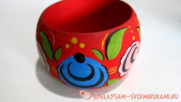 Шестой этап. После того, как роспись полностью готова, можно покрывать изделие лаком. Это делается для того, чтобы при носке браслета краска не смазалась или не поцарапалась. Стоит отметить, что при выборе лака нужно быть осторожнее. В первую очередь он должен быть бесцветным, иначе перекроет и обесцветит краску. Также нужно обращать внимание на то, насколько быстро и хорошо он высыхает, поскольку бывают лаки, продолжающие липнуть даже спустя несколько месяцев. Лак следует наносить мягкой кистью, дабы избежать смазывания краски. Покрывать лаком необходимо не только внешнюю часть браслета, но и внутреннюю. Как только лакировка окончательно высохнет, можно надевать и носить браслет, не опасаясь его испортить.