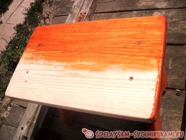 Перед покраской еще раз проверяем изделие на наличие дефектов, при необходимости стираем их и остатки карандаша. С помощью кисточки очищаем табурет от древесной пыли и приступаем к покраске.