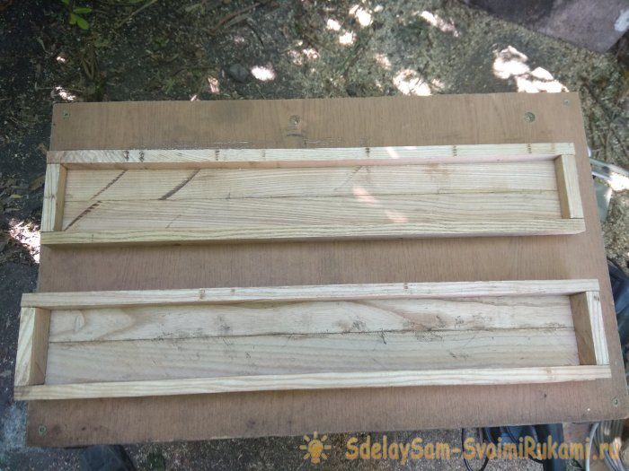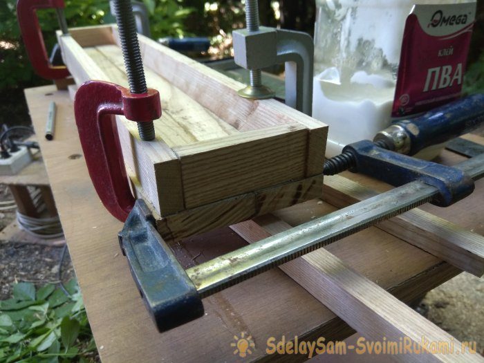 Заготовьте рейки необходимой длины. Корректировать длину, отрезая ненужное, можно при помощи электрического лобзика. В нашем примере внутренний размер футляра 50х6х5 см. Так как футляр состоит из двух частей (нижняя часть, куда будет ложиться флейта и крышка), то чтобы получилась общая высота 5 см, необходимо нижнюю часть сделать высотой 3 см, а крышку высотой 2 см. Все рейки необходимо склеить клеем «ПВА», и стянуть на несколько часов струбцинами. После того как клей высох, можно приступить к шлифовке дерева.