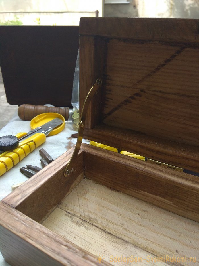 Когда лак высохнет, можно прикрепить фурнитуру. Сначала лучше прикрепить петли. Для этого отступить равное расстояние от краев, (в данном случае 5 см), и при помощи дрели сверлите отверстия для петельных саморезов, после чего закручивайте их при помощи отвертки.