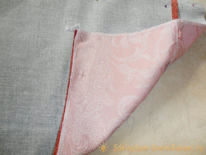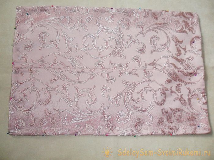 Сколола заготовки из портьерной ткани и мебельной, сложив их «лицом» друг к другу. Сначала положила клапан, а на него основу задней стороны наволочки, обработанными краями друг к другу.