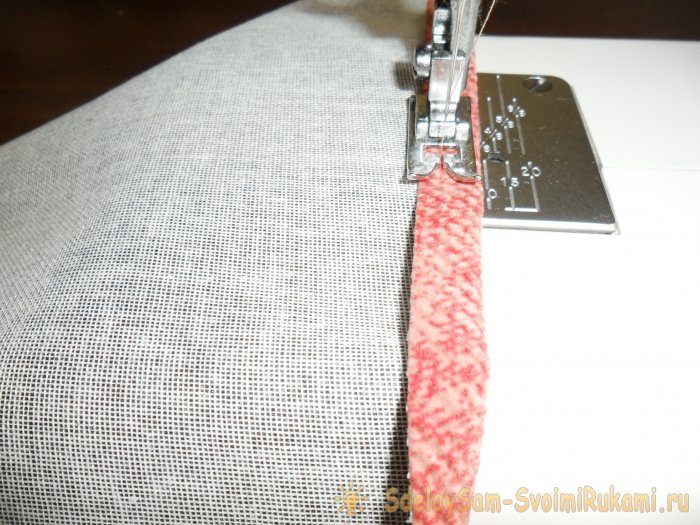 На каждой заготовке из мебельной ткани обработала край по стороне длиной 44 см. Просто подвернула ткань внутрь на 1 см и прострочила на машинке.
