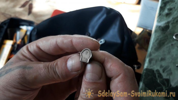 Сделать это необходимо потому, что новые бегунки идут с расширенными пазами, для лучшего удобства при установке. Итак, молния работает. Далее нужно соединить разрезанные звенья молнии. Для этого отрезаем от алюминиевой пластины полоску, 2×10 мм. Заостряем с обоих концов, делаем из неё скобу.