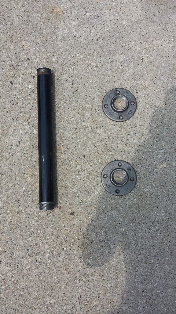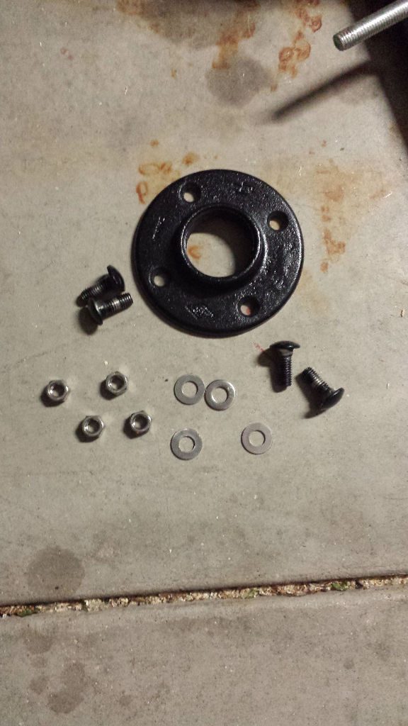Все необходимые комплектующие я приобрел в местном строительном магазине. Трубу я купил и разрезал там же. Фланец трубы, который будет установлен на деревянную основу, дорабатывать не придется, поскольку здесь мы будем использовать установочные винты нужного диаметра. А вот фланец, который будет крепить диск к трубе, должен иметь отверстия чуть большего диаметра (их придется сверлить), чтобы в него сели болты с более широкой головкой.