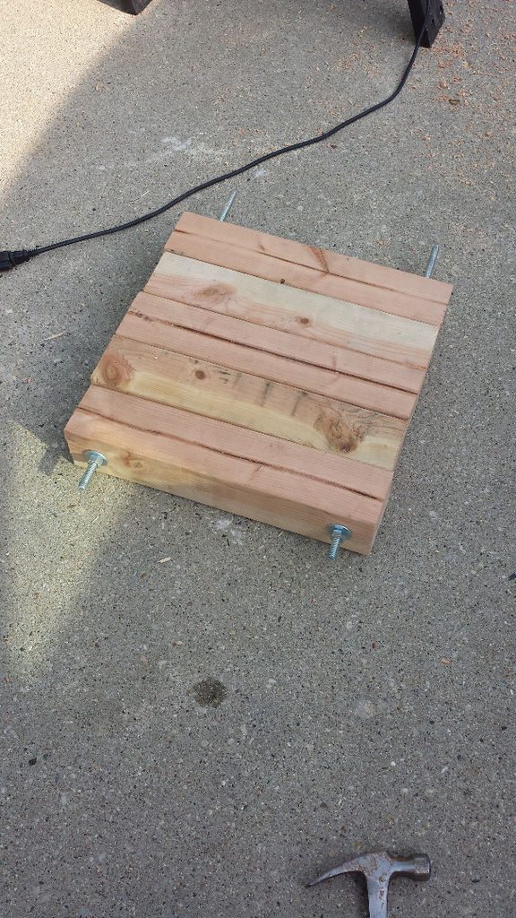 Затем я просверлил отверстия на концах брусков, используя направляющую деревянную пластину с заранее просверленными пазами. В идеале я бы хотел использовать сверлильный станок, чтобы отверстия были совершенно одинаковыми, но поскольку у меня его не было, я взял обычную дрель. Затем я просунул резьбовые стержни через отверстия, после чего отшлифовал готовое основание.
